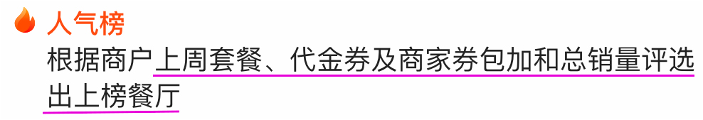 这个榜单是大众点评按照商家近期的综合流量排序的,它直接反馈了商家在大众点评上所有运营动作的结果,并加以放大。
