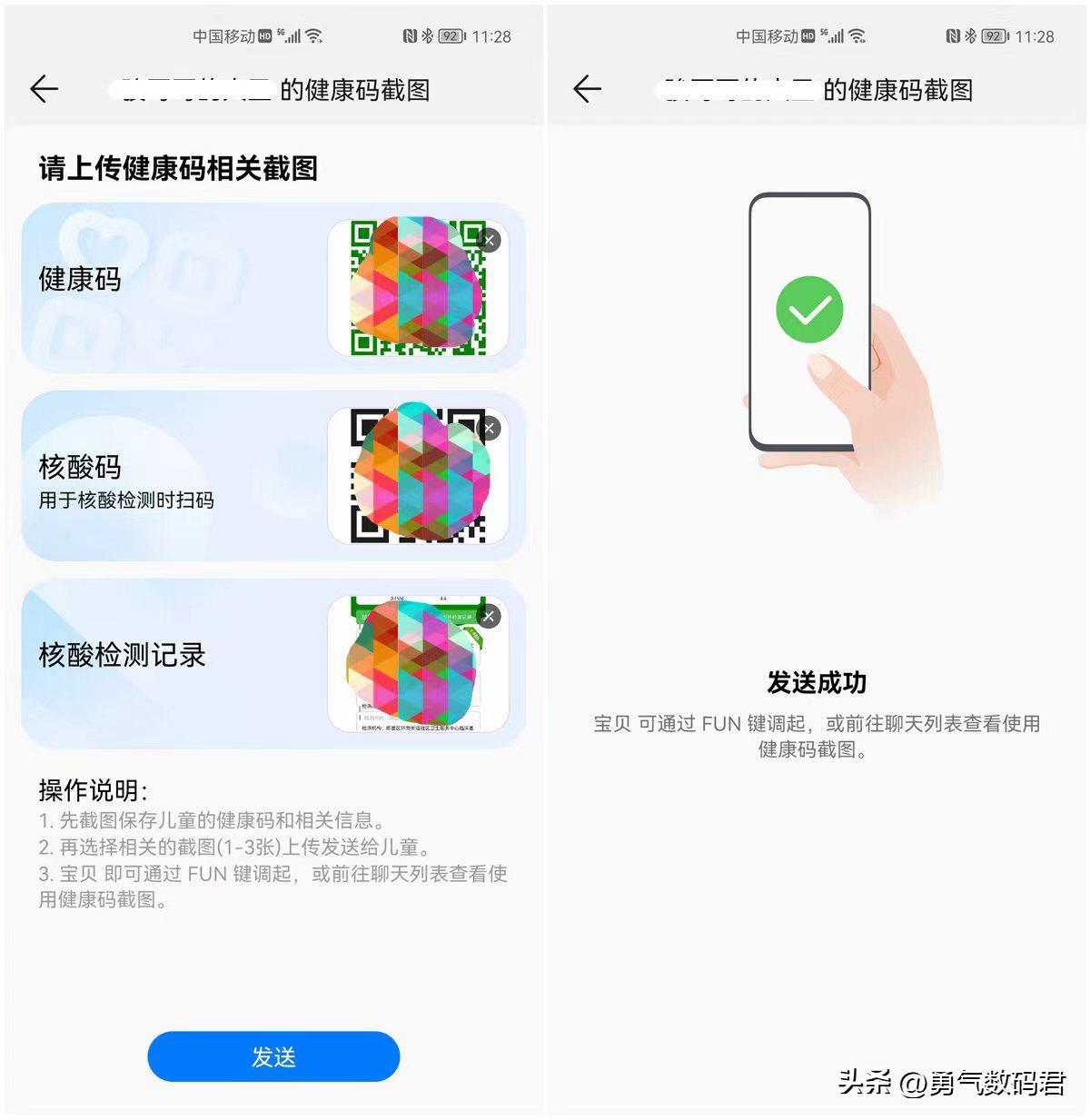 健康码截图功能,具体是怎么操作的呢?如果孩子遇到需要健康码的场景,家长只需要在华为儿童手表专用的“智能关怀”APP上,点击“健康码截图”,将相应图片上传至“健康码”、“核酸码”、“核酸检测记录”,再点击“聊天”发送,孩子即可在手表端快速查看这些图片,说实话这个功能不仅家长省事,而且也不用麻烦孩子带纸质健康码了。
