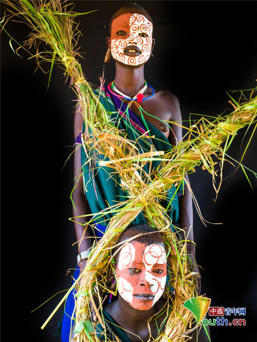2021年4月27日讯,埃塞俄比亚和苏丹边境地区,苏瑞部落原住民在镜头前展示他们色彩鲜艳的面部彩绘,以及引人注目的鲜花头饰。苏瑞部落是目前生活在非洲的3000个部落之一,依然践行着传统的生活和装饰方法。摄影师Kurt Mueller造访当地时拍摄了这些照片。