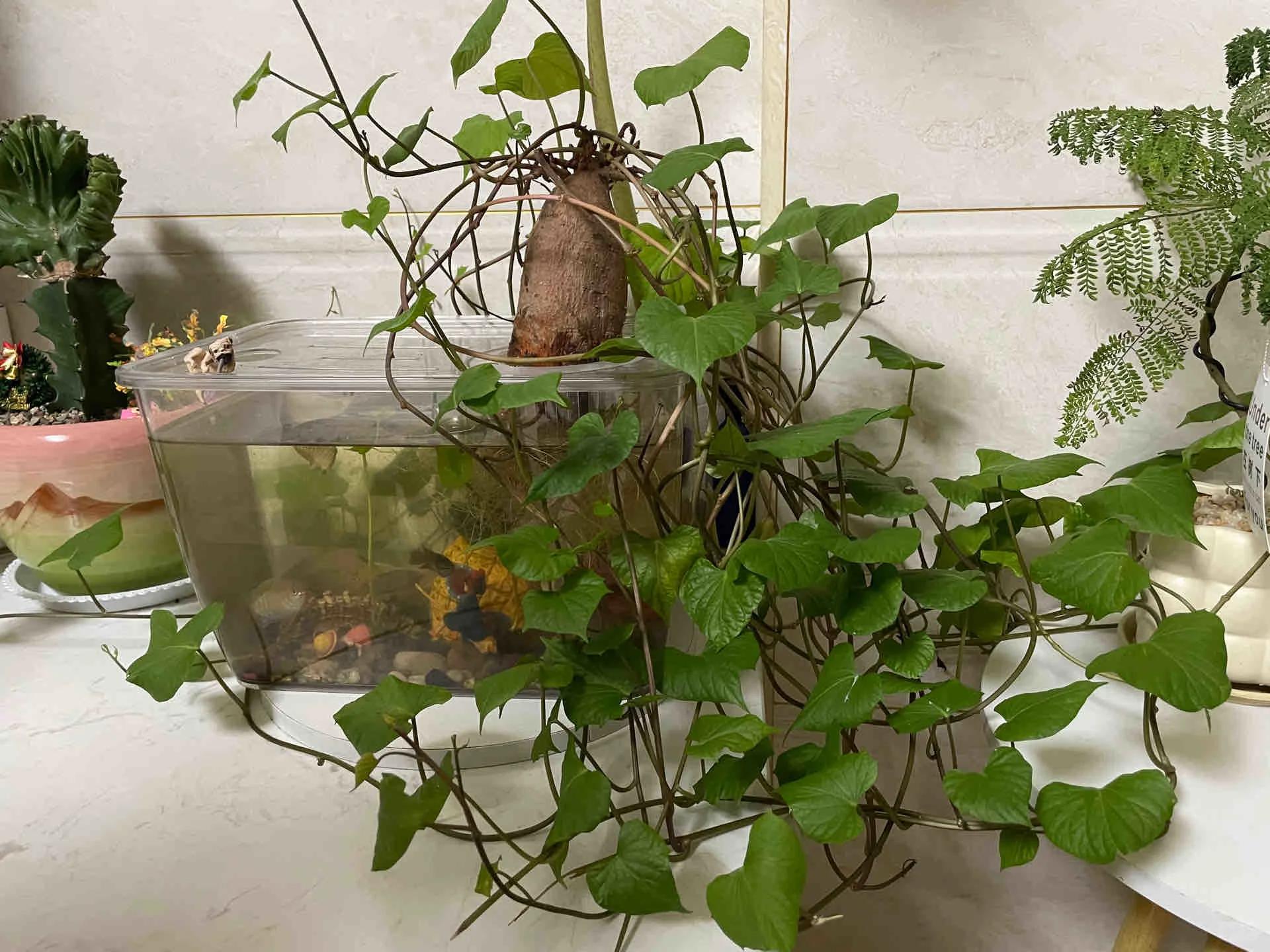 广东一女子,因把婆婆的红薯放鱼缸里养火了,枝繁叶茂,太治愈了