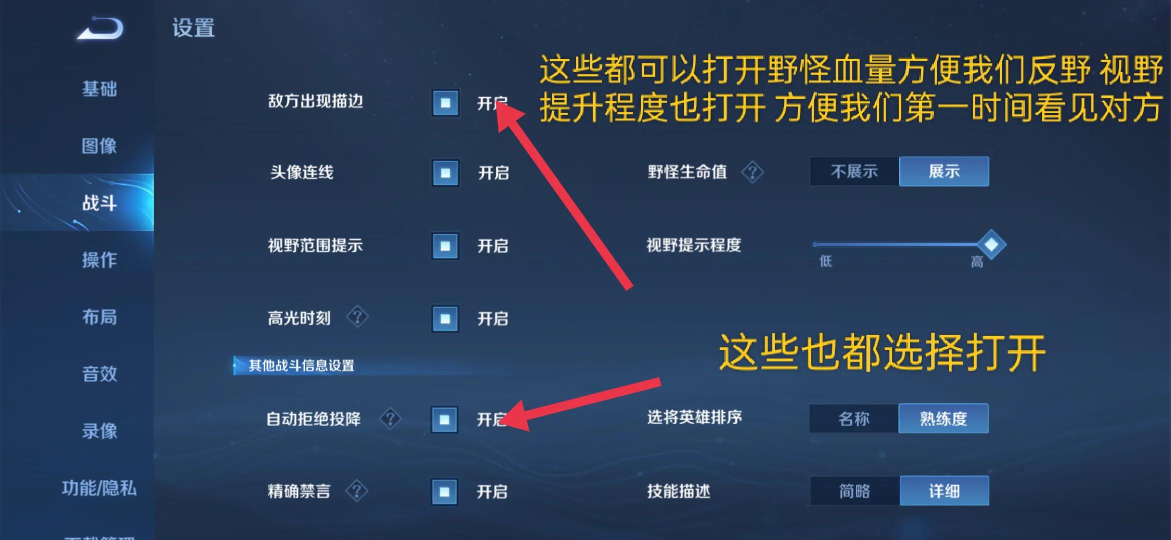同样技能冷却小数打开,好为我们打出极限操作铺垫,局内名字和标签关闭,增加局内简洁度。