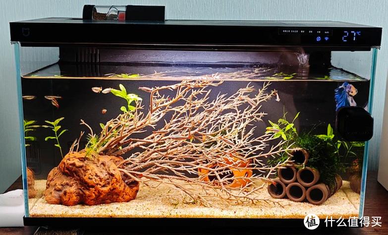 让我和我家领导各退一步的中和办法,就是画法几何专门给米家这款小鱼缸设计的景观,陶瓷石头+塑料枝桠,虽然仔细看有点假,但主打一个好打理,而且确实也算个景儿。
