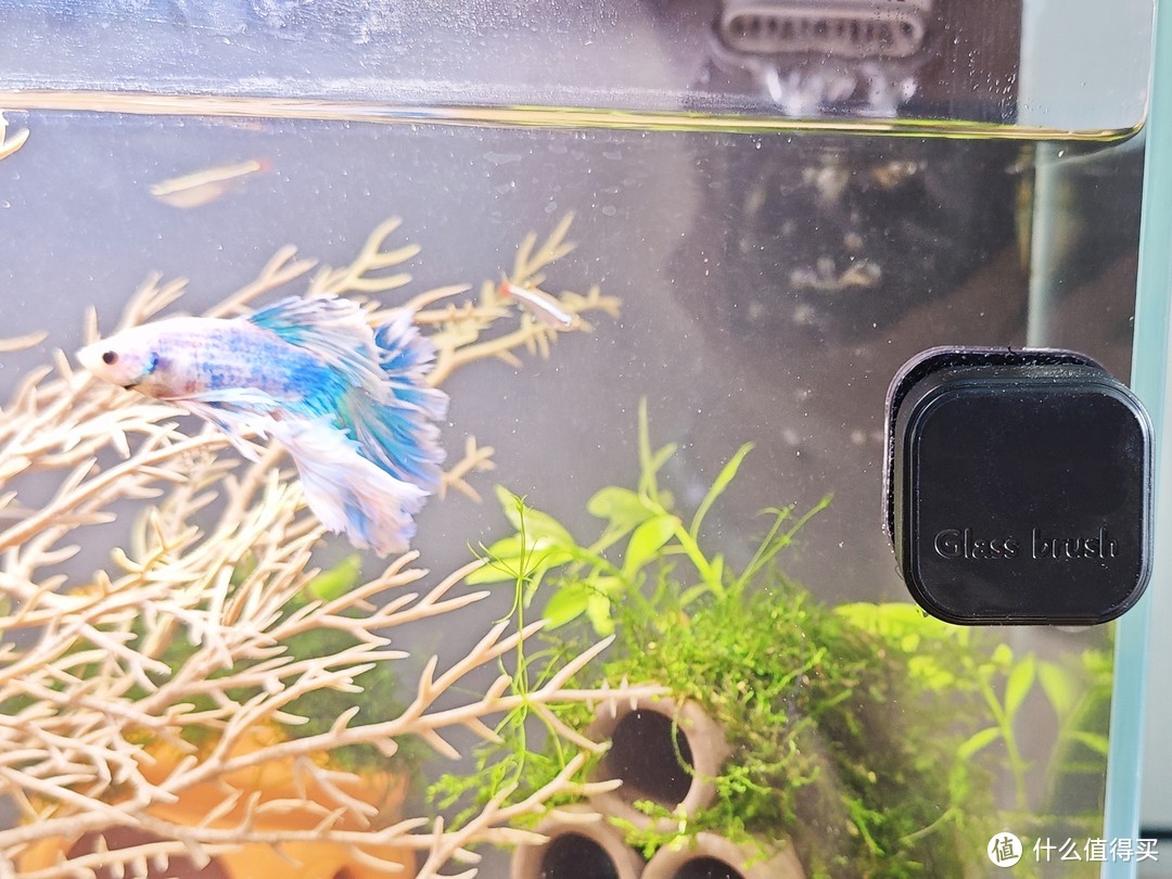 它是钕铁硼强磁材质的,一直泡在水里也不会掉落。一面是硬刷除藻,一面是软刷可刷缸(仅能清理图片上的状态),水里那面还带着小镜子,能骗斗鱼展展尾巴,一举多得。