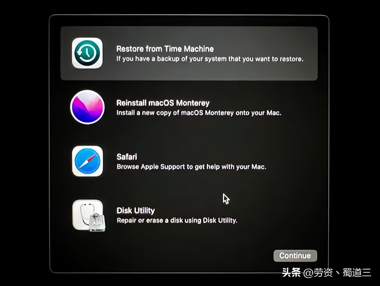 从时间机器恢复:选择此选项可从最近的时间机器备份中恢复Mac的数据。插入您的驱动器,选择此选项,并等待过程完成。