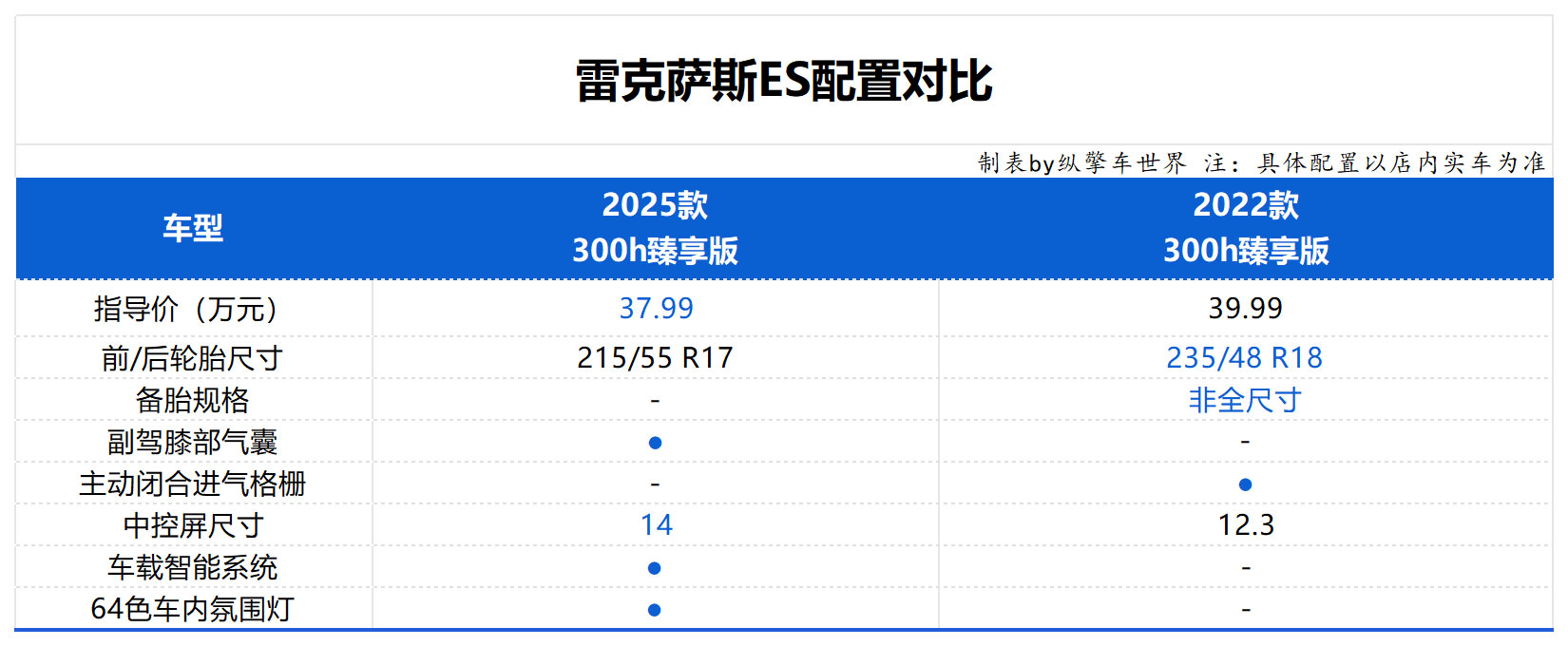 另外三款车型均不再提供主动闭合进气格栅,2025款300h臻享版价格降低了2万元,轮胎尺寸也从235/48 R18变为215/55 R17;2025款300h尊享版将老款的真皮材质座椅变为仿皮;2025款300h行政版取消了感应后备厢以及方向盘加热功能。