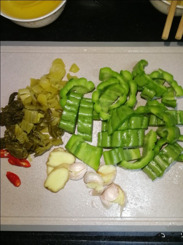 1先把苦瓜对半切开,用铁勺子刮去瓜囊,刮越干净越容易去除苦味,然后切大块;2酸菜泡洗一下,然后切小;3蒜头拍碎,取掉外皮,姜切片,小辣椒切小