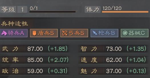 董卓作为一个御7英雄,他的基础属性是绝对对得起这个定位的。武力87成长1.85,统率85成长2.07,这个身板虽说比不上关二爷诸葛亮这种大哥级武将,但也属于能打能抗的范畴。再加上盾兵弓兵S,骑兵A的兵种适性,所以整体不算差。