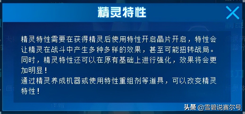 ②.不同的特性对应的效果各异,具体的效果可通过在精灵背包中对应的“特性”信息一栏中找到。