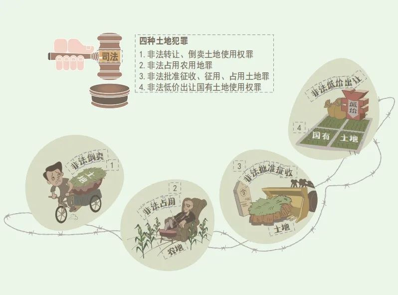 一是非法转让、倒卖土地使用权罪。刑法第二百二十八条规定,以牟利为目的,违反土地管理法规,非法转让、倒卖土地使用权,情节严重的,处三年以下有期徒刑或者拘役,并处或者单处非法转让、倒卖土地使用权价额百分之五以上百分之二十以下罚金;情节特别严重的,处三年以上七年以下有期徒刑,并处非法转让、倒卖土地使用权价额百分之五以上百分之二十以下罚金。