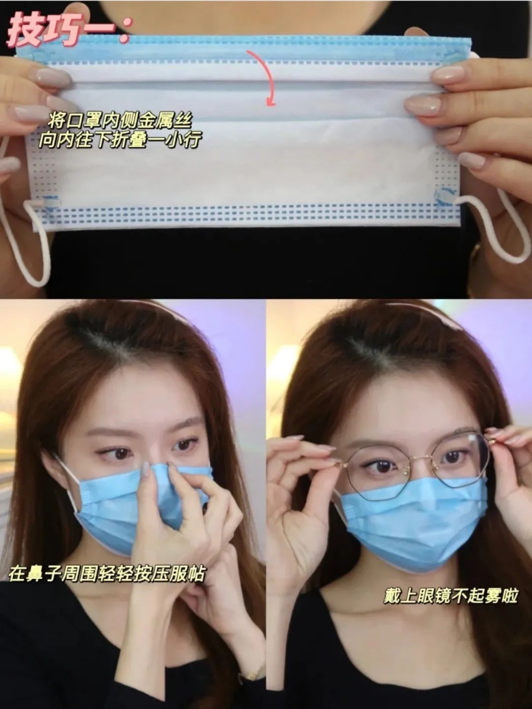 首先从源头解决口罩起雾这个大问题,将口罩内的金属条往里一折,再戴上眼镜压在口罩上面,就能很好的防止起雾了。