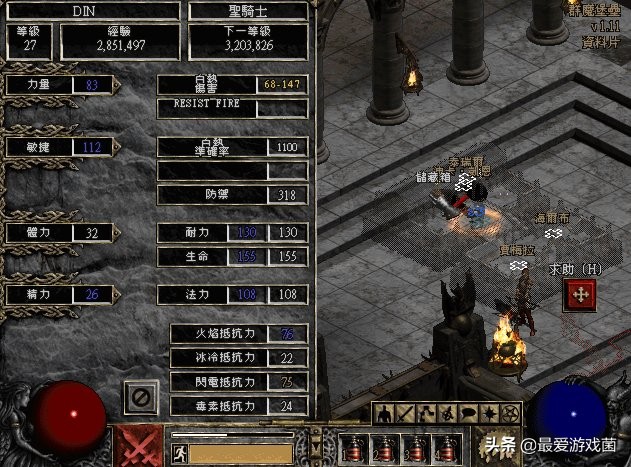 需要声明一点,由于我们所使用的圣骑士所以在开启了抗火光环之后,火焰抗性在短时间内得到了巨幅提升,在面对大菠萝时仅凭借两项抗性叠满就足以完美抵抗猩红闪电的伤害。