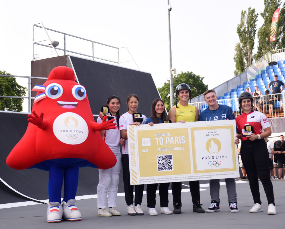 6月22日,通过资格系列赛获得自由式小轮车女子公园赛巴黎奥运会参赛资格的选手在颁奖仪式上合影。当日,巴黎奥运会资格系列赛布达佩斯站自由式小轮车女子公园赛决赛在匈牙利布达佩斯举行。中国选手孙佳琪和邓雅文位列第三、第四名,美国选手汉娜·罗伯茨和佩里斯·贝内加斯分别获得冠、亚军。新华社记者 贺灿铃 摄