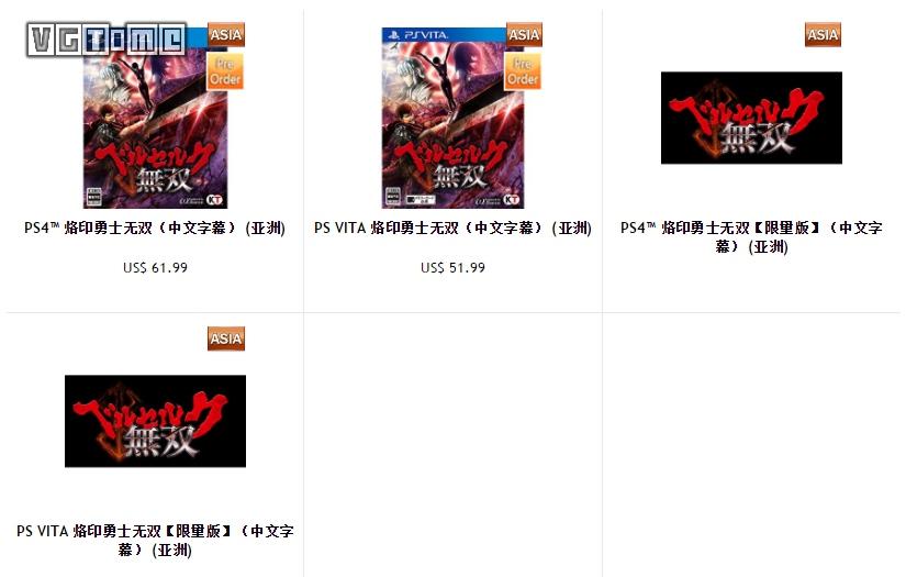 根据渠道商 Play-Asia 消息,动作游戏《剑风传奇 无双》(烙印勇士无双)将推出繁体中文版,还有限量版,对应PS4/PSV,发售日暂未公布。
