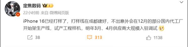 此外,据知名数码博主的消息,iPhone 16开始打样了,打样线已经在成都建好,不出意外的话,部分国内代工厂会在12月的开始架生产线,试产工程样机,明年3月、4月供应商大规模入驻调试。