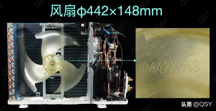 ▲自然风Pro使用仿生翼型风扇,φ442×148mm接近1.5匹最大尺寸,循环风量比上一代增加约20%,换热能力提升10%以上,并且噪声更低。