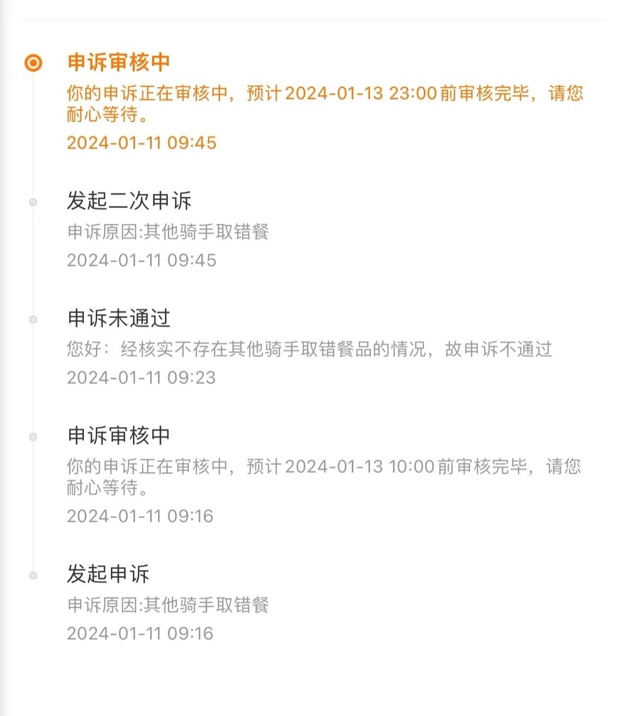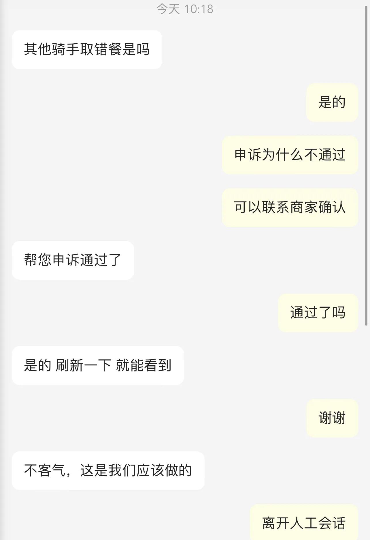 第一单就非常不顺利,提前20分钟到店,结果单被其他骑手拿走,问商家能不能按照单子再来一份,说是不行。第一次遇见这种情况,当时我就懵了,取消订单,直接罚款14元,我看可以申诉,没有办法,不能等着啊,就取消了订单,结果,申诉失败,我不服,第二次申诉,还是失败……我表示不服气,不是我的问题,为什么要扣我14块钱,于是直接智能人工客服,说了一下经过,人工客服看了申诉记录,直接通过,返回14元……