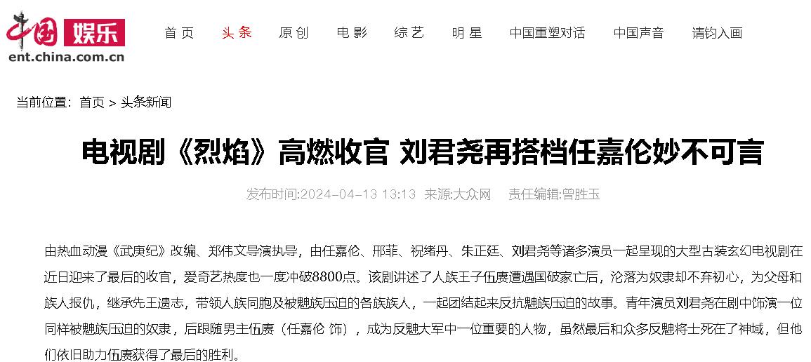 中国网《电视剧《烈焰》高燃收官 刘君尧再搭档任嘉伦妙不可言》2024.4.13