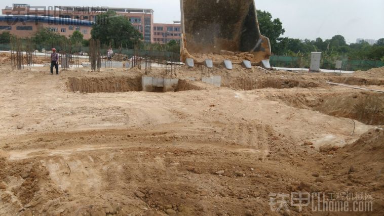 3、只要有地方让你停挖机挖,挖四方型的基础,建议你挖机在基坑边对着挖机其中一条链条对直挖,这样挖出来的基坑就能四四方方。注意,要在你站机的地方先整平,让你的挖机站稳。