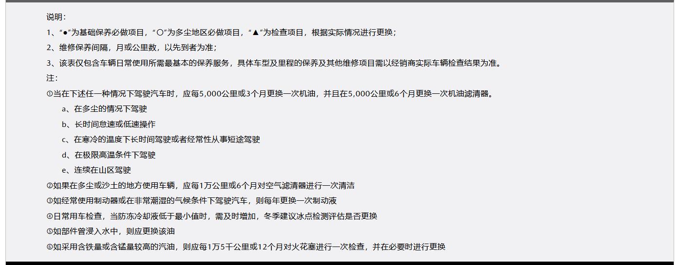 3、该表仅包含车辆日常使用所需最基本的保养服务,具体车型及里程的保养及其他维修项目需以经销商实际车辆检查结果为准。
