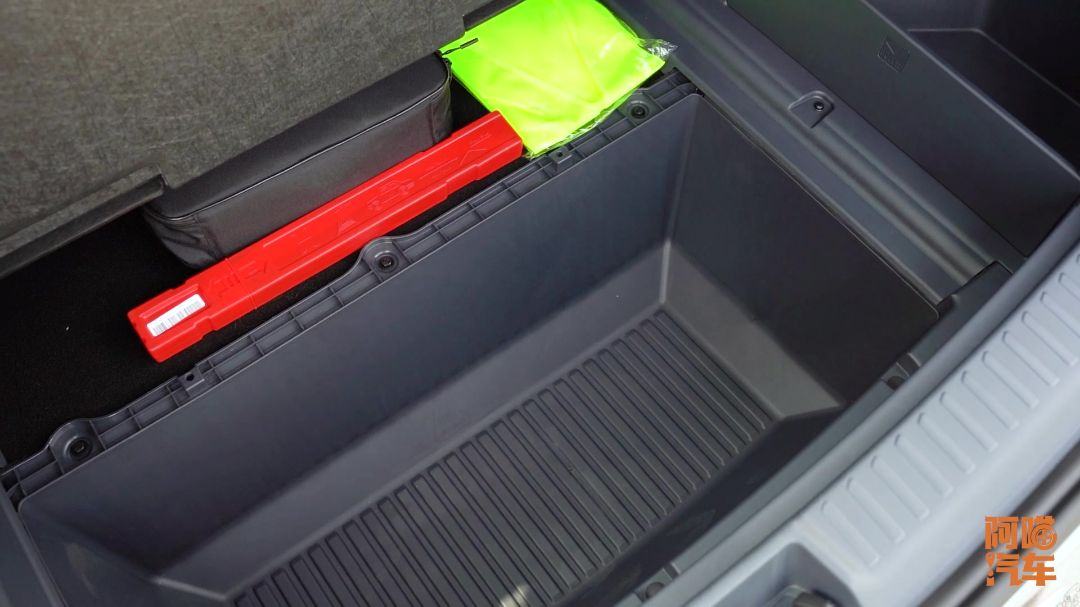 接着我们来看一下尾箱空间,尾箱这个地台是偏高的。但是我们把板子一揭,下面就有一个很深的挖坑。喵哥我身高虽然不高,但是,我往里面一坐下来之后,它已经到了我胸部的位置了。所以可见这个地方有多深。