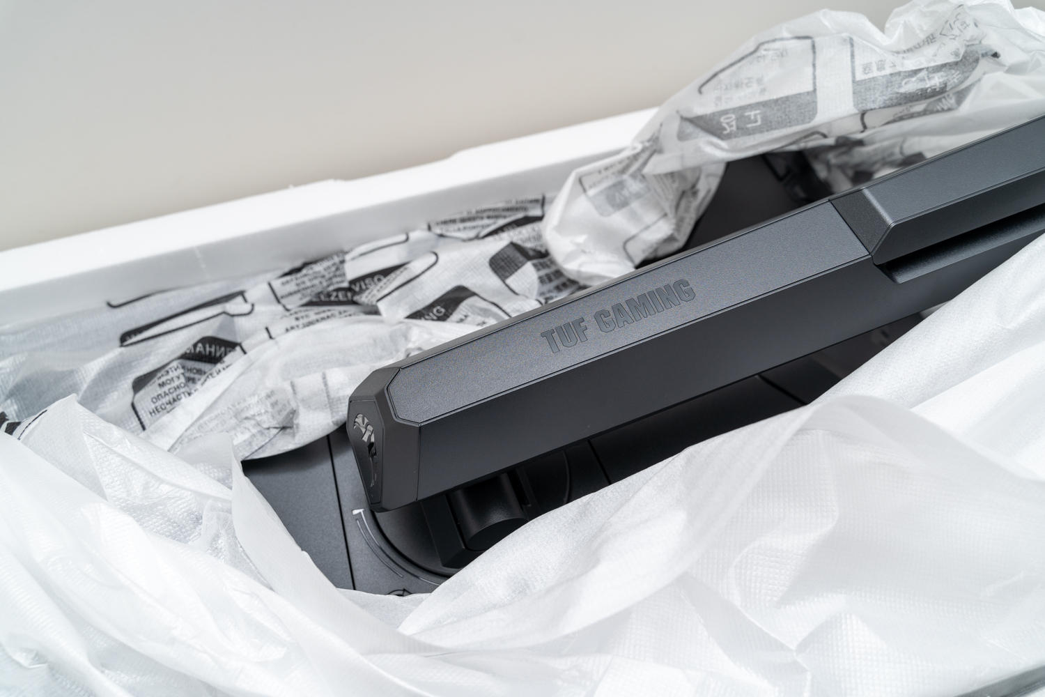 也是我见过最厚的一款,侧面是显示器的一些规格标签和重点宣传点,12个图标一目了然。黑灰色的颜色搭配上面有显示器的渲染图,渲染图下有小小的尺寸27寸68.6cm,中间是TUF GAMING的logo,左上角还有ASUS的logo。右侧是TUF GAMING VG1A SERIES系列。打开包装可以看到泡沫上不同位置的框,里面放的内容也不同
