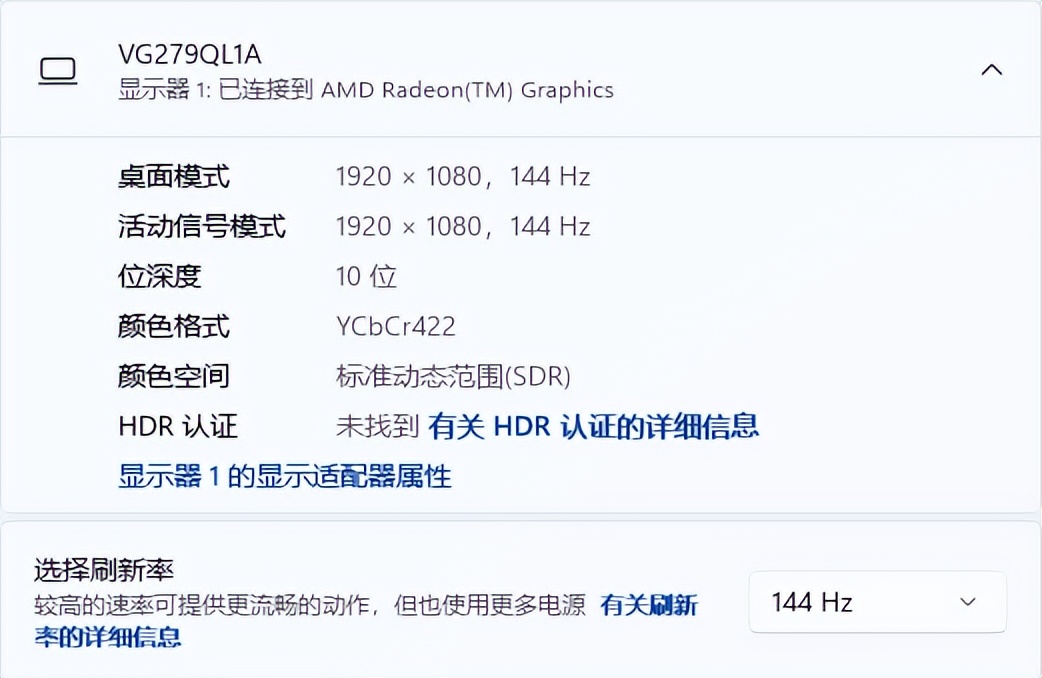 默认状态下接入之后直接显示是10bit色深还有144Hz,可以直接调出来,不过华硕TUF VG279QL1A实际上是165Hz的,所以这部分需要去OSD设置。