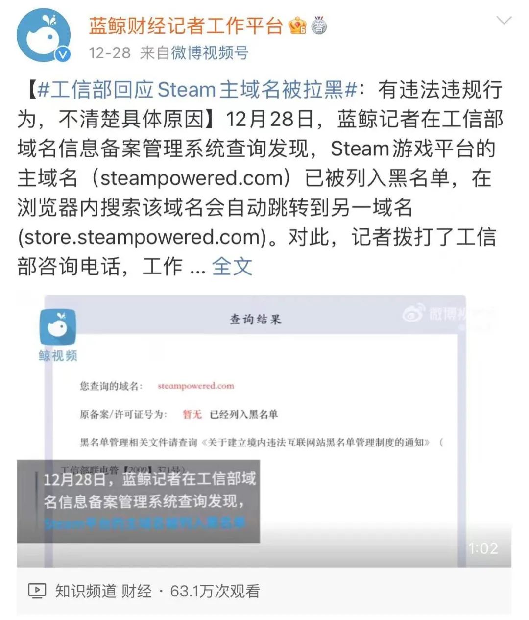 在工信部域名信息备案管理系统查询发现,Steam游戏平台的主域名已被列入黑名单。