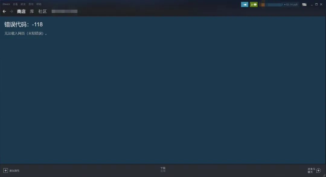 以往在不开加速器情况下,能够直接裸连的商店界面,现在登陆会出现类似“错误代码-118”的提醒,无论重登还是刷新都没办法正常加载。