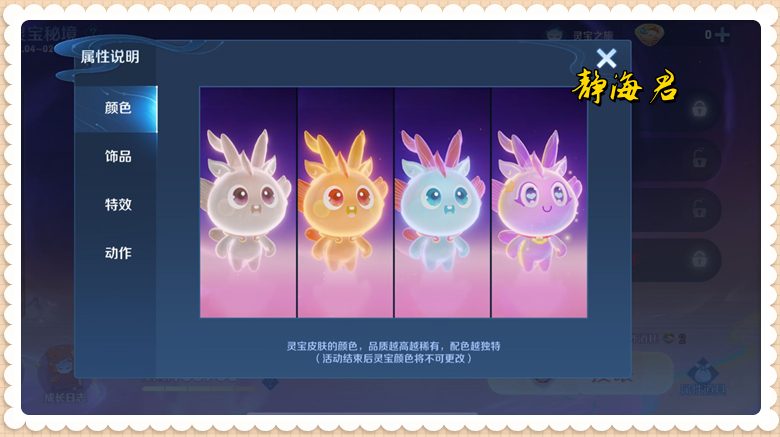 - 对于属性来说,品质越高的越稀有,对应的配色更独特,款式更精美,特效更华丽,互动更丰富。
