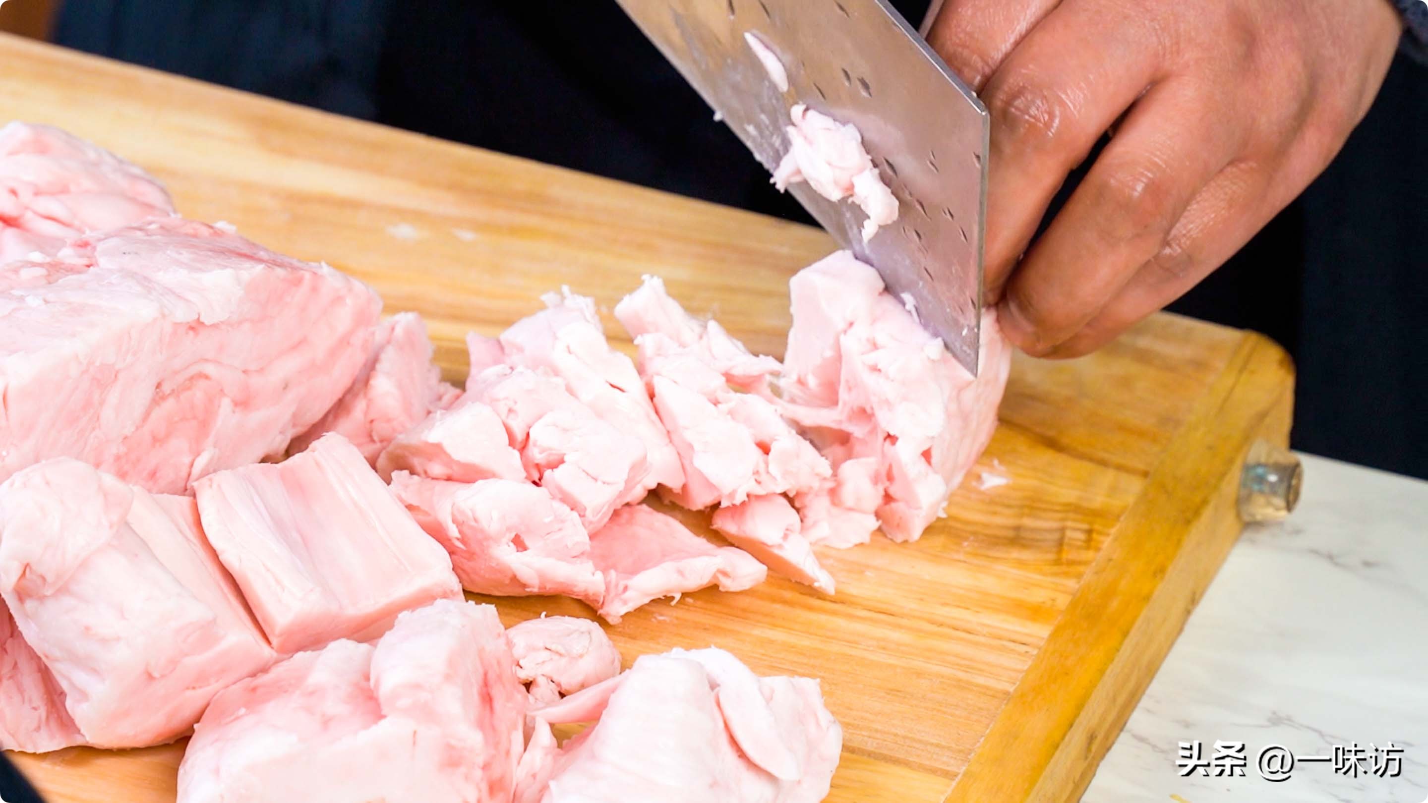 我们需要选用猪板油来制作猪油,将选择的猪板油切成小块,以便更容易熬制。切猪油的时候手比较容易油,要全部切完后用热水加肥皂清洗手和刀。