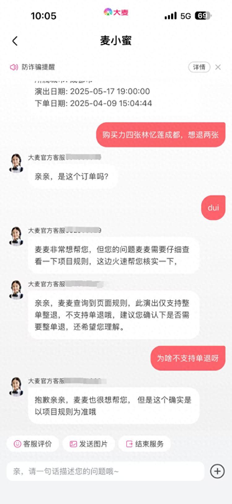 万女士也有同样的经历,她购买了5月初华晨宇演唱会佛山站的两张门票,因同行人无法前往,希望退掉一张,同样被客服告知只能整单退。对于无法单张退票的原因,大麦客服回应万女士:“主要是因为会影响整个演出座位的安排和其他观众的观影体验。”