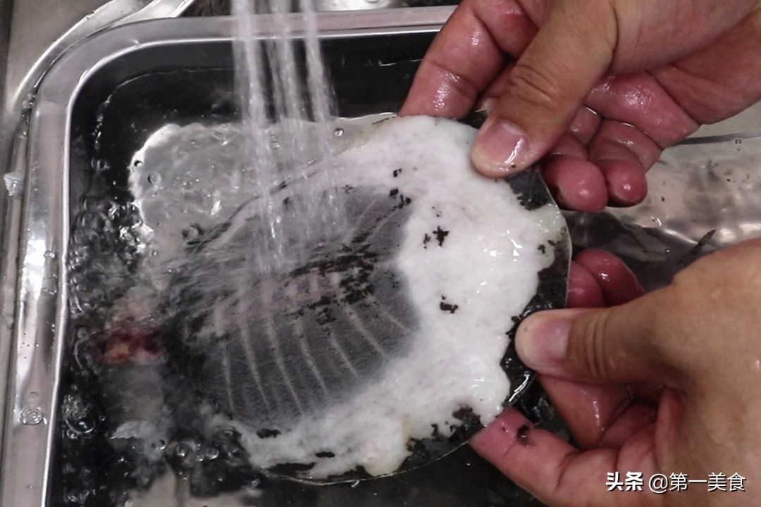 2.甲鱼已经让卖家宰杀过了,现在我们来清洗一下:烧一锅开水,冷却降温至80度以后倒在甲鱼身上,让甲鱼洗个热水澡。然后把甲鱼捞出来撕掉背上的那层黑膜,这层膜比较腥一定要去掉,怕热可以用凉水泡一下再撕。