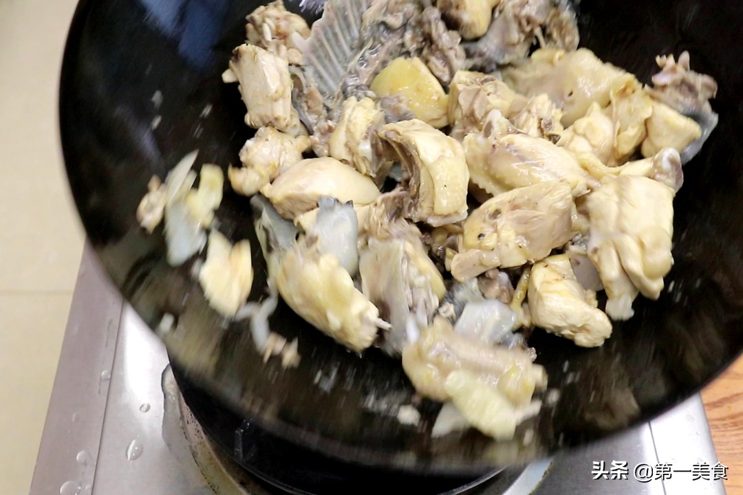 5.接着,我们开始炖汤:热锅凉油倒入鸡肉和甲鱼,开中火慢慢的炒出水分,炒出水分的鸡肉口感会更香,而且炒出油脂以后炖出来的汤水会更浓白鲜香。