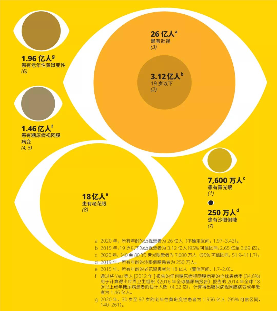 据世界卫生组织(WHO)于2020年发布的《世界视觉报告》显示,在全球范围内,至少有22亿人近视力或远视力受损,其中至少有10亿人的视力损害本可预防或有待解决。