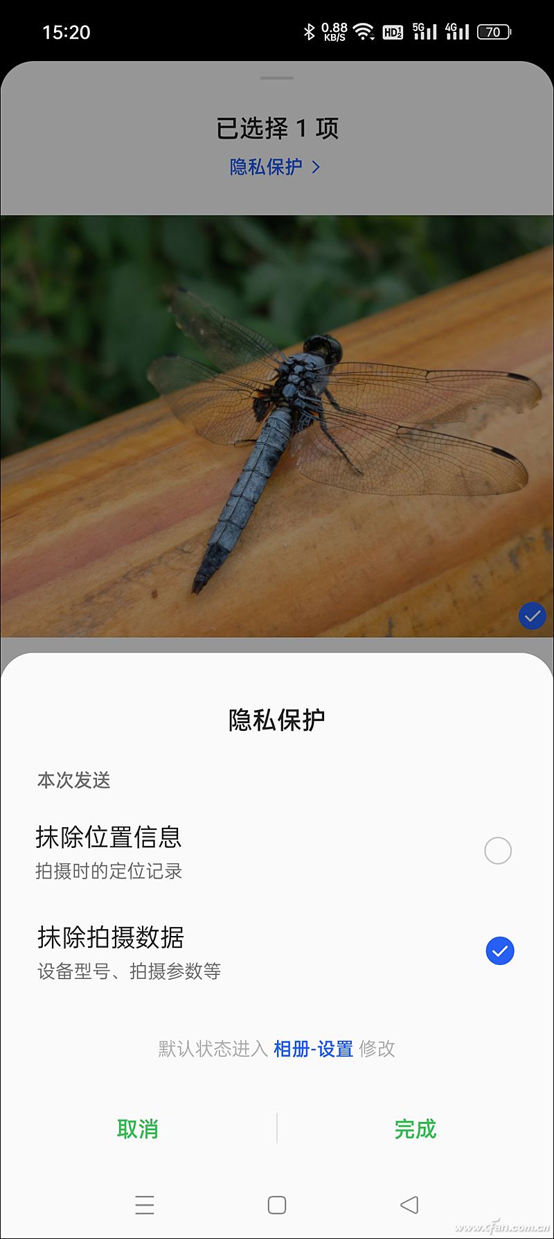比如,当你想给某好友分享照片,又不希望对方通过EXIF信息窥探你的隐私,那就不妨打开系统自带的相册APP,找到需要分享的照片点击底部的“发送”按钮,在弹出的选择界面中再点击顶部的“隐私保护”,就能在发送时选择是否抹去照片中包含的位置和拍摄数据信息了。