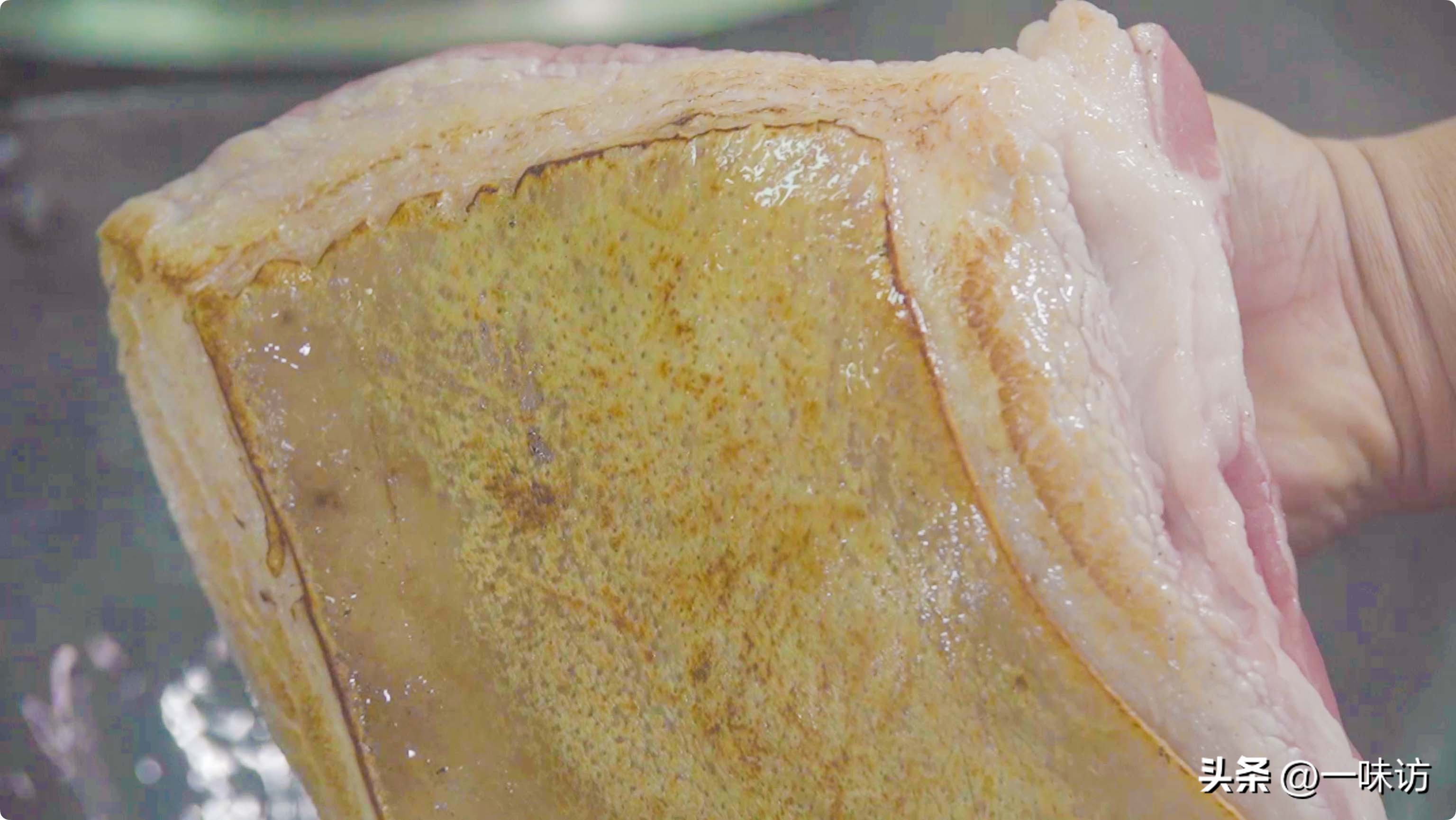 把五花肉翻起来皮朝上,用打火机或者锅烧热烧掉多余的猪毛,这样猪肉吃起来就不会发腥。