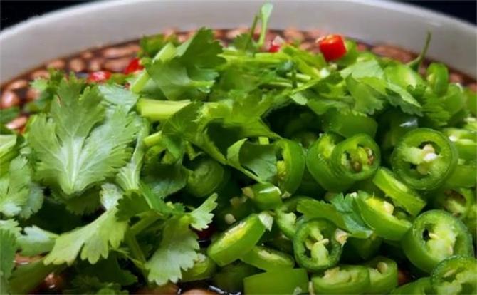 花生米、小米辣、杭椒、大蒜、香菜、八角、香叶、花椒、清水、白糖、老陈醋、生抽、香菜