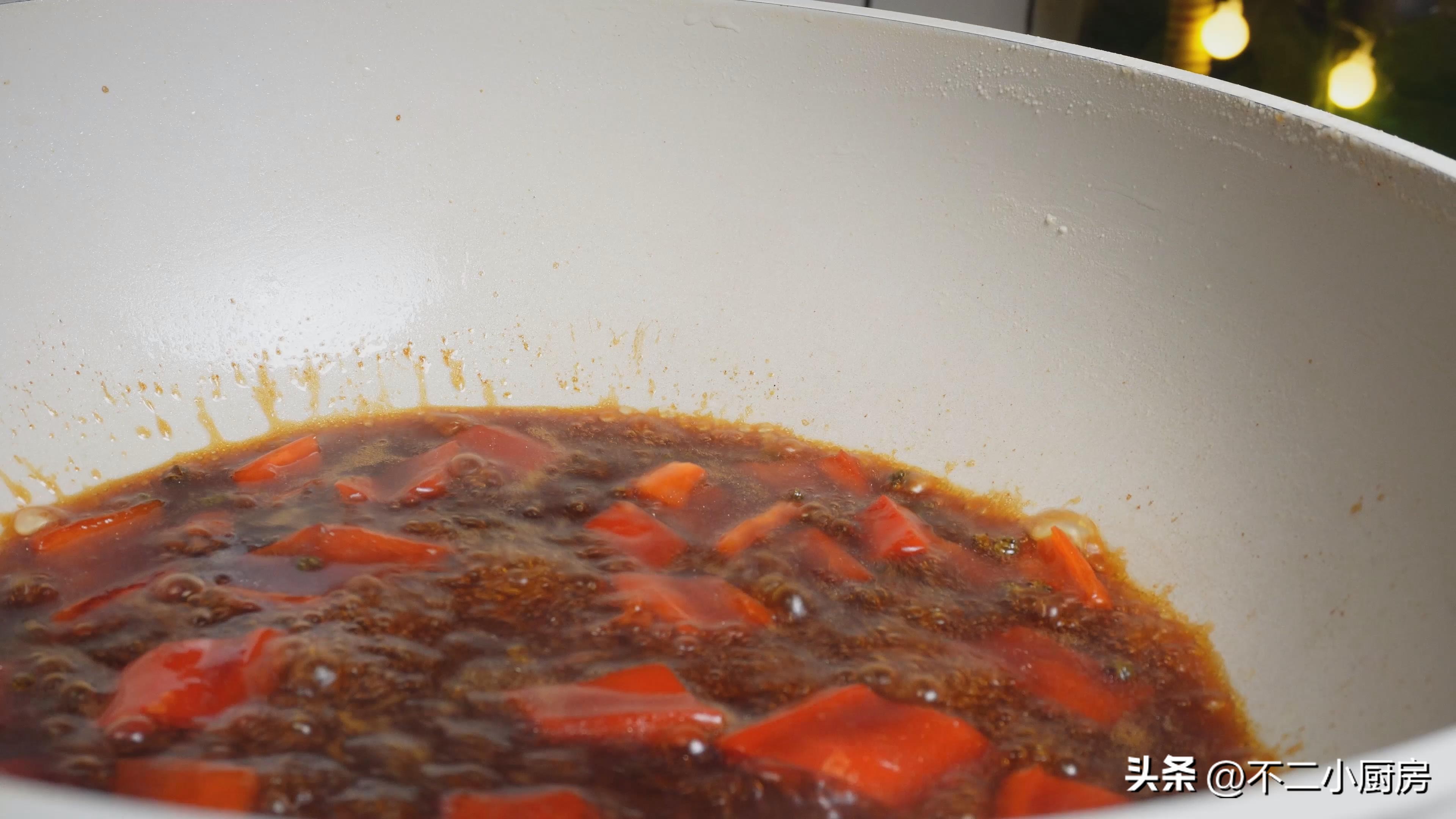 7、另起锅加入花椒,把红椒加进来,用小火快速的煸炒一下,把花椒和辣椒的味道给它煸炒出来,这里的火一定不要调的太大。然后加入我们之前调好的料汁,用铲子不停的搅拌,直到汤汁比较粘稠,像这个样子。