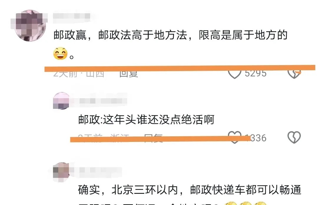 想象一下,当你开车遇到限号限行的时候,不得不绕道而行。可邮政车呢?照样大摇大摆地开过去。限高杆?对不起,挡不住邮政车。甚至有人说,邮政车的路权仅次于军队,这话虽然有点夸张,但也不是完全没有道理。