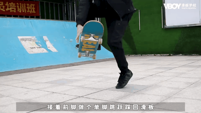 接着,前脚做个单脚跳跃落回滑板上 ,一个boneless就完成了。