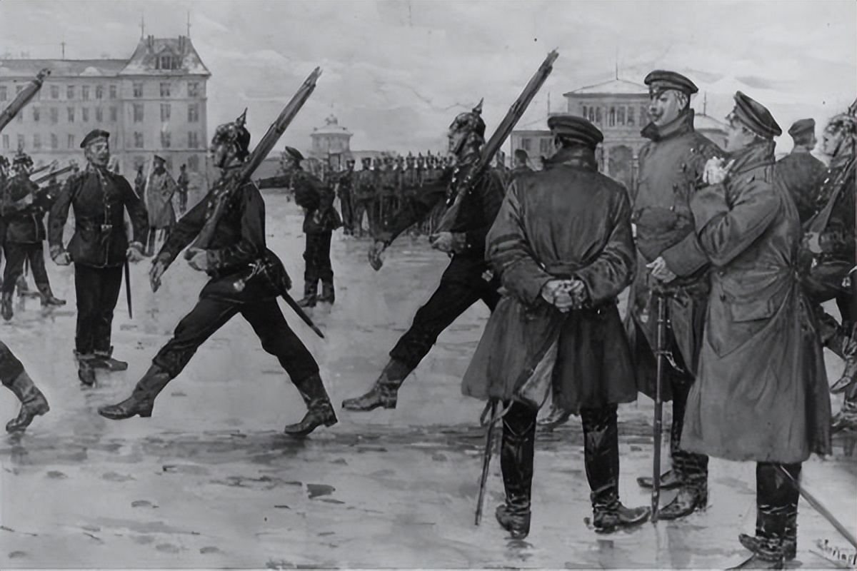 在战场上,普鲁士士兵在军官的高亢口令下,整齐划一地踢出发出巨大声响的步伐,在一定程度上就能够威慑敌人,另一方面,这也展现出了普鲁士军队严格的纪律和高昂的斗志。