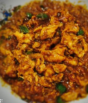 做鸡蛋酱,一勺黄豆酱加小半碗水稀释,搅匀备用。打三个鸡蛋,搅散,炒锅倒油,烧热,倒鸡蛋液,鸡蛋液凝固后划散,倒入黄豆酱水,小火煮至汤汁浓稠。黄豆酱比较咸不用放盐了。放青椒丁和葱花,再炒半分钟,盛出备用。