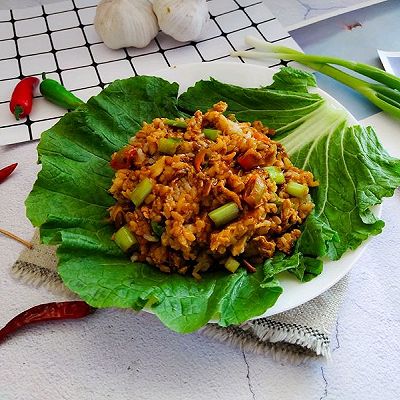 拿一片白菜叶摆盘子里,拌好的饭放在菜叶子中间,下边折上来包一下,左边包一下,右边包一下,有点像包孩子一样哈。然后双手捧起来,开吃吧!