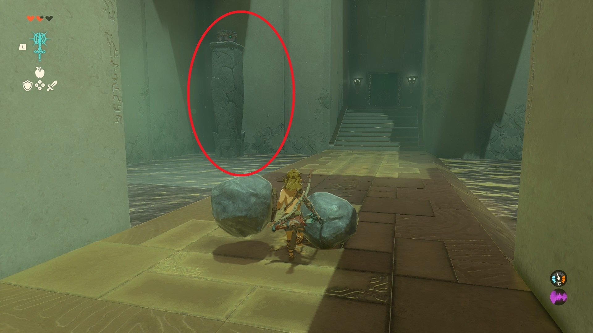 在乌可乌候神庙内,玩家会解锁第一个能力“究极手”。装配两个木板,增加长度,协助我们抵达对岸。在这之后,右边角落的柱子上有一个宝箱,用刚刚的木板搭起斜坡就能抵达上方。另外,还可以利用两块木板垫脚,用究极手将宝箱抓下。