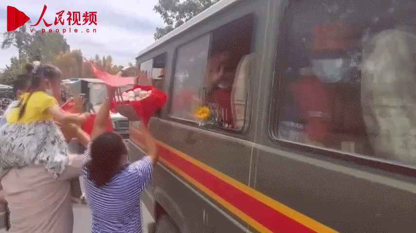 不断有群众向车里扔矿泉水