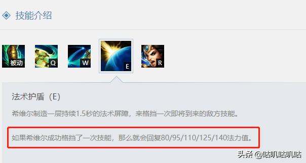 大招狩猎不仅可以给自己提供攻击速度,还能为在1000码距离内的队友提供提供移动速度加成,可以用来主动发起团战,具有很强的团队功能性。E技能法术护盾能阻挡一些关键伤害和技能,比如石头的大招、女警的夹子、诺手的大招等,但是不能阻挡普通攻击和持续性伤害,比如莫甘娜的W等,阻挡成功后还能恢复自身法力值,现在一级就能回复110点法力值。
