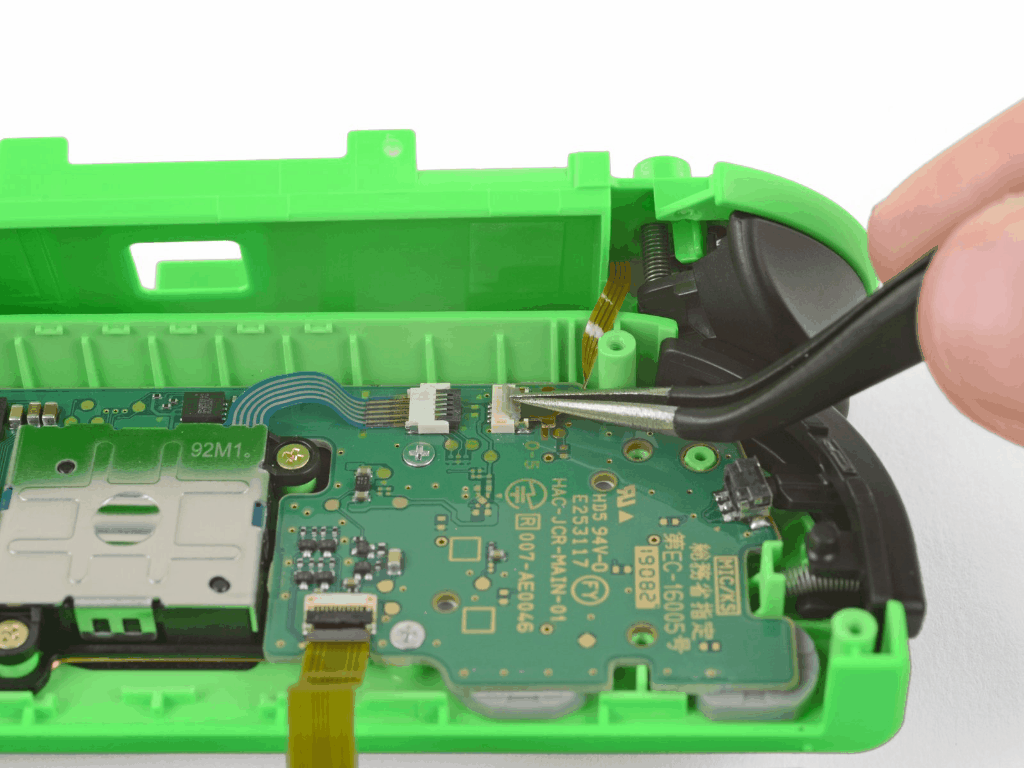 第十一步:断开摇杆的排线。还是先用镊子翻开连接器的锁止机构。然后再慢慢分离排线。