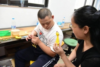 上午十点,有几名学员前来学习纸艺制作,陈小华便当起授课老师。“先将瓦楞纸卷成一个圆形,然后用胶水将其边缘固定住……”陈小华耐心指导学院完成每一处细节的制作。来此学习的学员们年纪不一,既有还在读小学的小朋友,也有已参加工作的成年人,还有一群特殊的群体——智力残障和自闭症儿童。