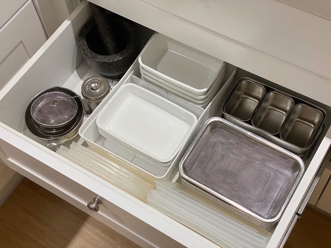 一般锅具的体积大又重,建议放在底层的抽屉,收纳起来更稳固安全。