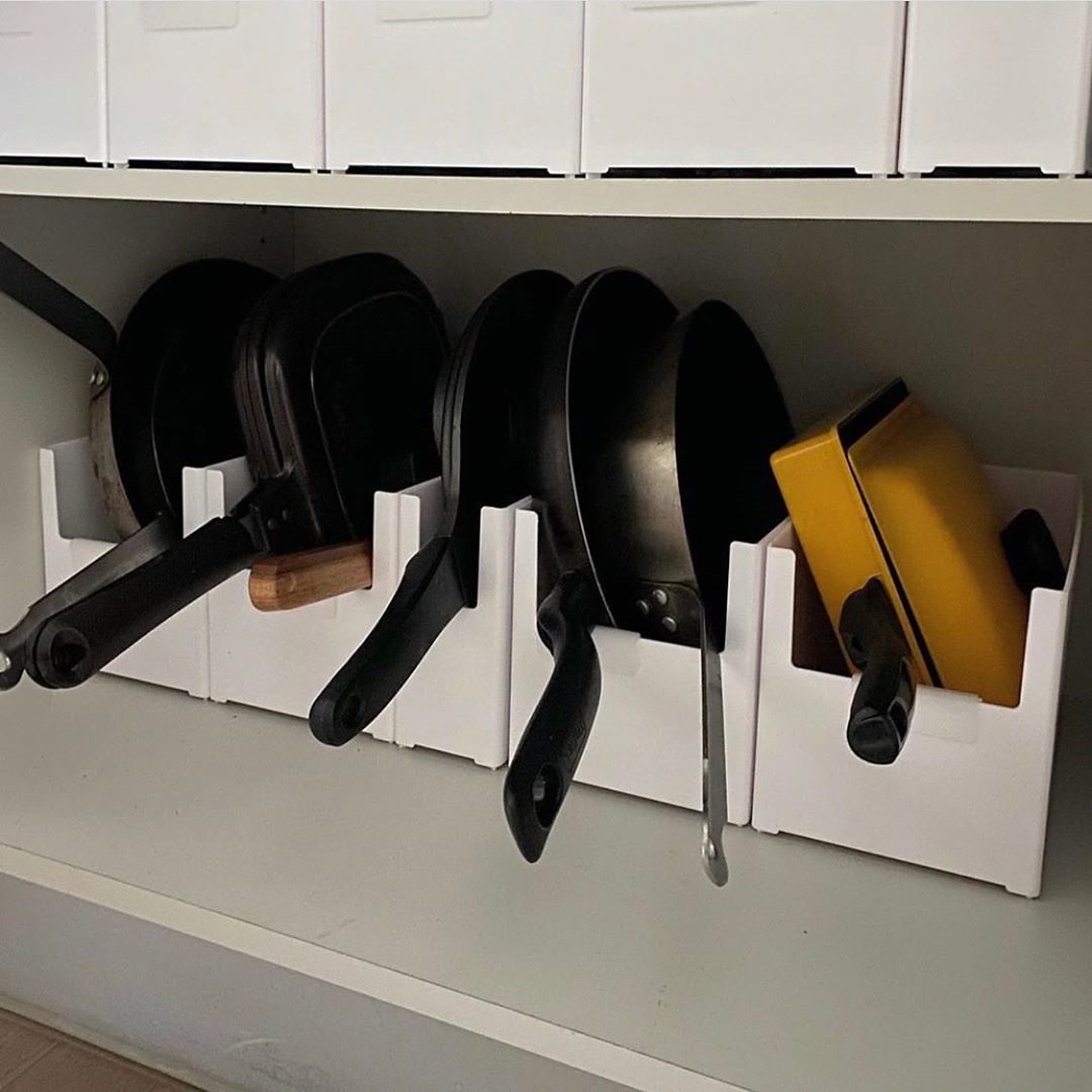 能用文件盒或可调节伸缩的锅具收纳架,即便是大小不一的锅子都好收。